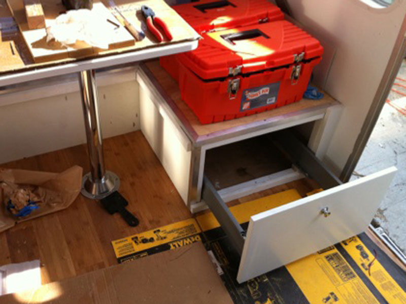 The dining table has been custom-made to match the bright white kitchen laminate. New mounting bases are securely fastened with Liquid Nails and glued screws. Again, the movement of the trailer is always a factor during the installation process.