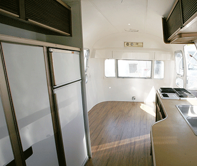Of course, as with all our Airstreams, we apply three coats of zero-VOC paint and intall beautiful laminate hardwood flooring to give it that clean fresh look and feel. There’s an ice-cold 2-way refrigerator, propane stove top, chrome sink, bathtub/shower, vanity sink.