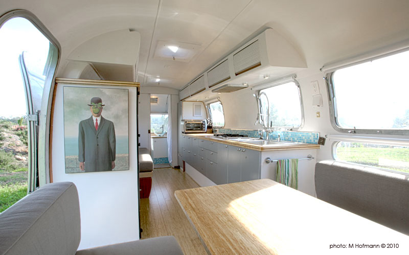 “Ever since I was a kid building 7-story tree houses I’ve liked reusing old stuff and making it usable again,” says its owner Matthew Hofmann, owner and founder of Hofmann Architecture, who spent the past eight months restoring the 25-footer. “It’s not only beautiful, it’s also useful.” “I’m at a point in my life where I’m trying to live with less” says Hofmann, who parked the Airstream on a Montecito home site that burned down in the Tea Fire.