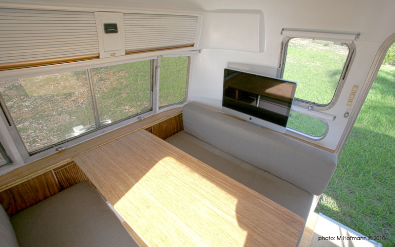 - Reuse – to take an existing product and use it for the same function or purpose, this is the most basic and simple method. For example, much of the cabinetry that was existing was saved in the Airstream project. The goucho (bed) was beyond saving, but the storage drawers beneath them made a beautiful base for the new bed. Even the faux wood paneling was reused. The new convertible couch looks like a rich piece of furniture amid the abundance of white walls. The overhead cabinetry was removed, modified, and re-installed to form a more pleasing alignment. All of the overhead cabinetry hardware was saved and reused, including the tambour rollup doors, plastic tracks, and metal pulls. The front dinette set is original, just refinished and painted. All of the original window trim was painted over by several previous owners, the paint was removed and restored to a brushed aluminum finish.