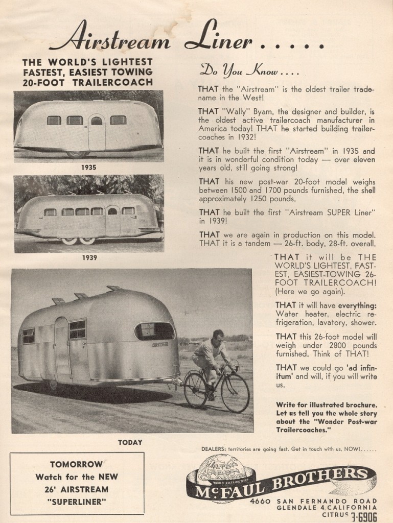 In a February 1947 Airstream magazine ad, Byam (forever the pitchman) created notoriety and American advertising history by proving that his travel trailer was so well-balanced and lightweight that it could be pulled by French bicyclist Jean Letourneau.