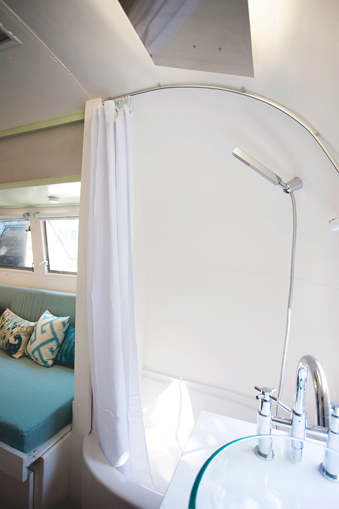 Clearly, the new owner has a keen eye for colors, too. We love the seafoam green and pale greys and blues she selected. It goes perfectly with her choice of interior upholstery and awning.