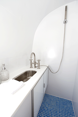 A full-function kitchen and bathroom design features custom-crafted solid walnut cabinetry in the kitchen and painted bathroom lavatory, with white solid surface countertops and oversized under-counter sinks.