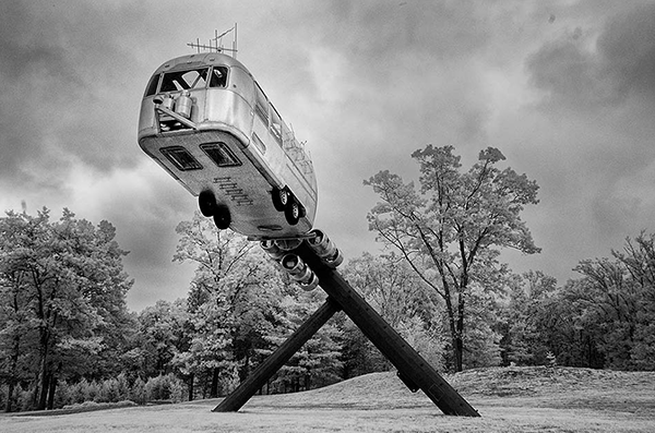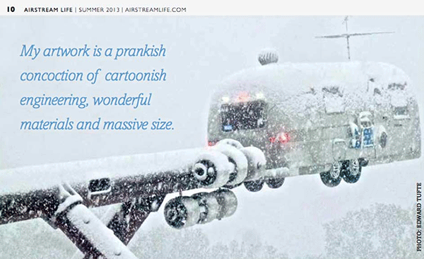 The Airstream sculpture is 31 feet high and was built from 2012-13 and stands among other large sculptural works on his farm, which in total weigh some 700 tons. Tufte calls his magnificent works of art, “megaliths.”