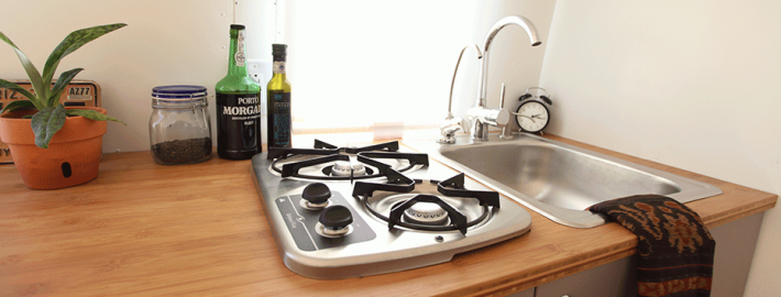 The first thing you’ll notice about this Bambi is it doesn’t feel small. There’s a shocking amount of storage – under seats, in cabinets, drawers, overhead and even a closet. The kitchen has ample space for food prep and cleaning.