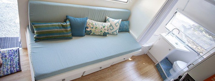 Clearly, the new owner has a keen eye for colors, too. We love the seafoam green and pale greys and blues she selected. It goes perfectly with her choice of interior upholstery and awning.