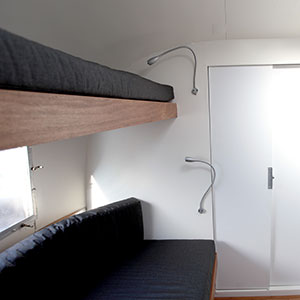 The living space sleeping arrangement provides for a large convertible space in front for the parents with an easy-open-close queen bed in a back kids room. There are lots of storage compartments, drawers and hidden nooks for of the kids’ gear.